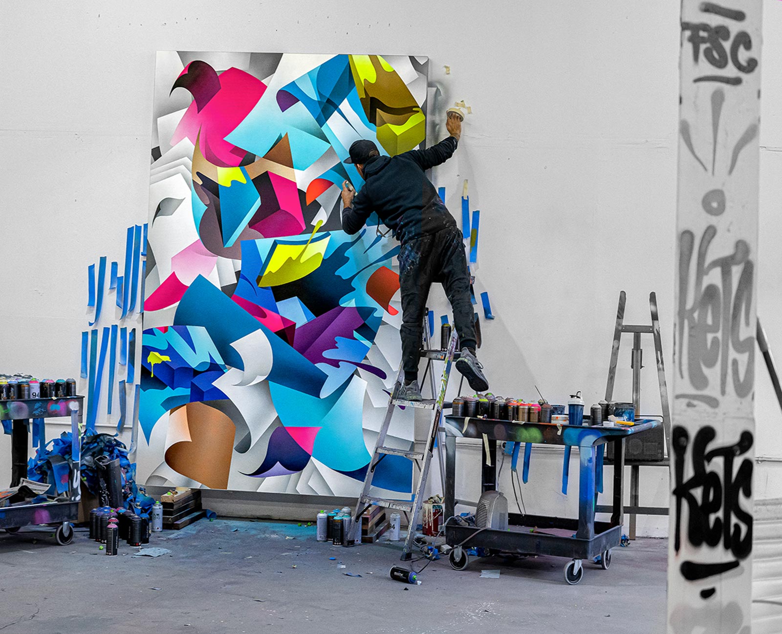 Mikael B’s nyeste serie af originale malerier med akryl og spraymaling, hvor ekspressive penselstrøg møder geometrisk struktur.