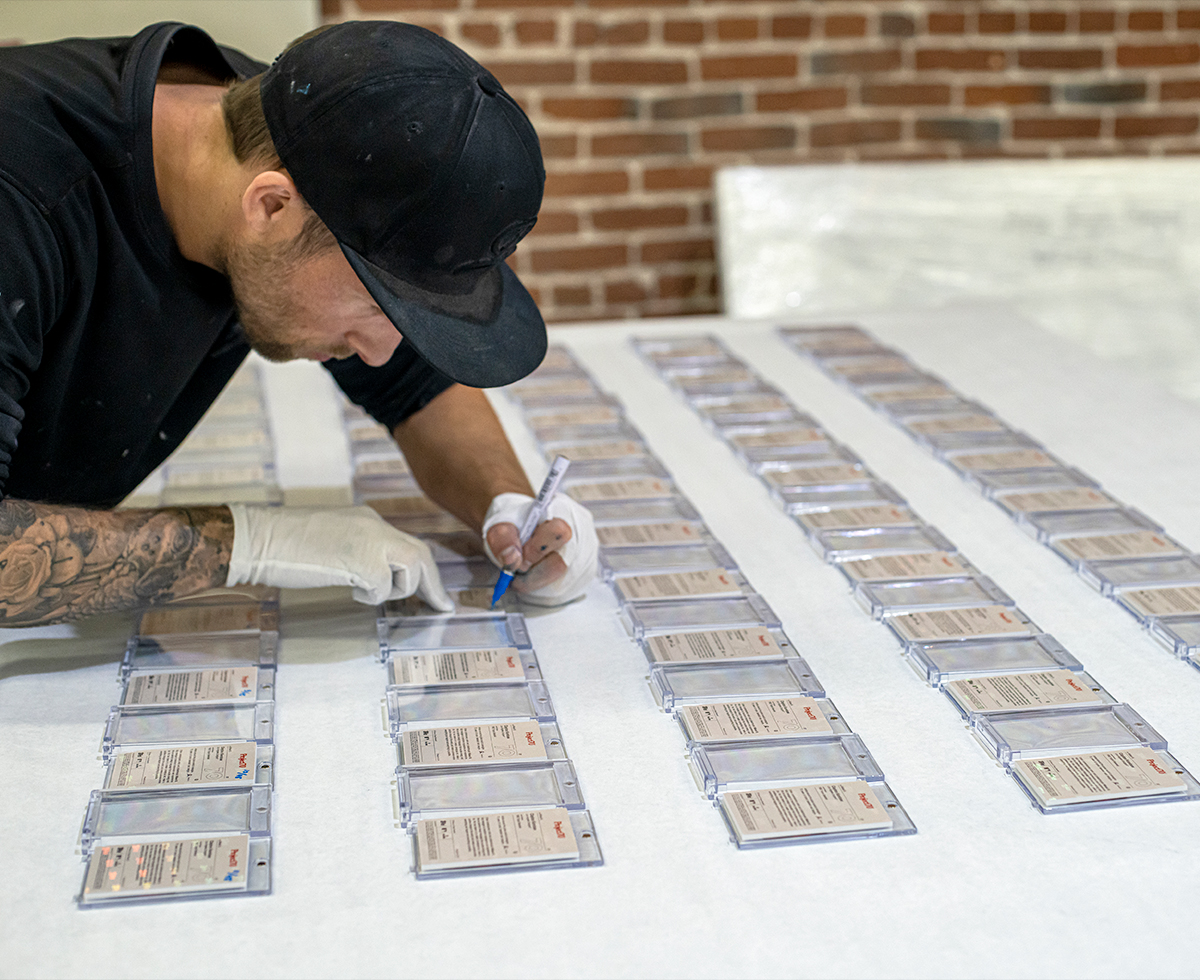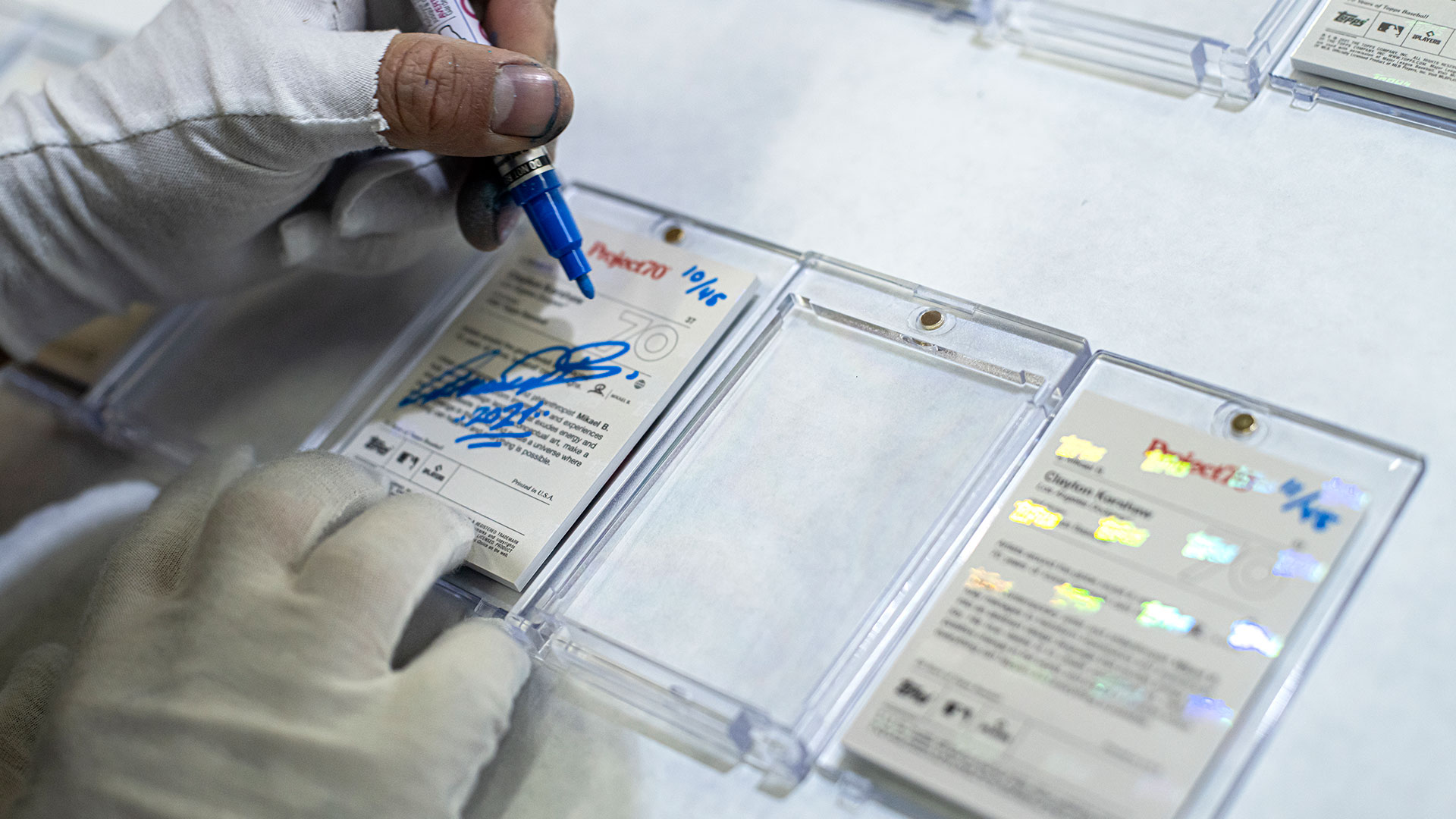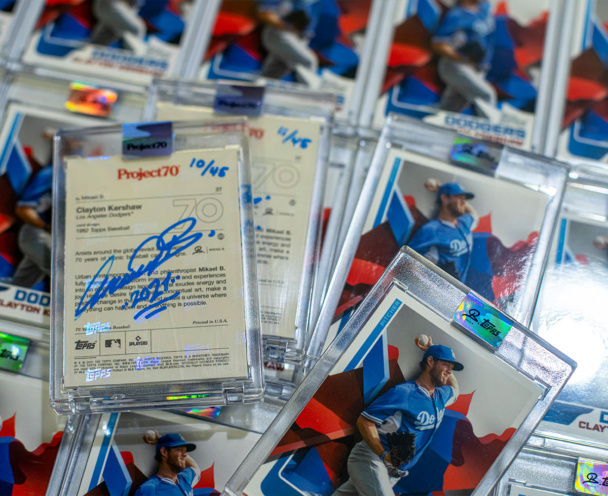 - Indkapslet i beskyttende plastiketui med Mikael B x Topps holografisk forsegling