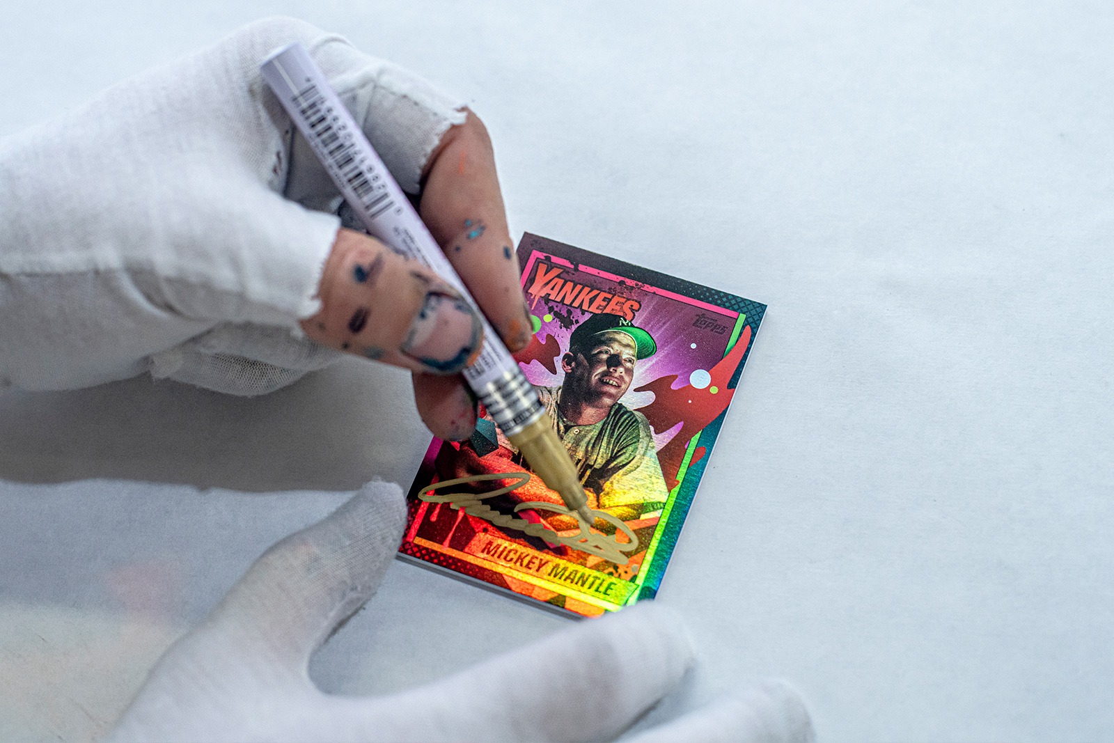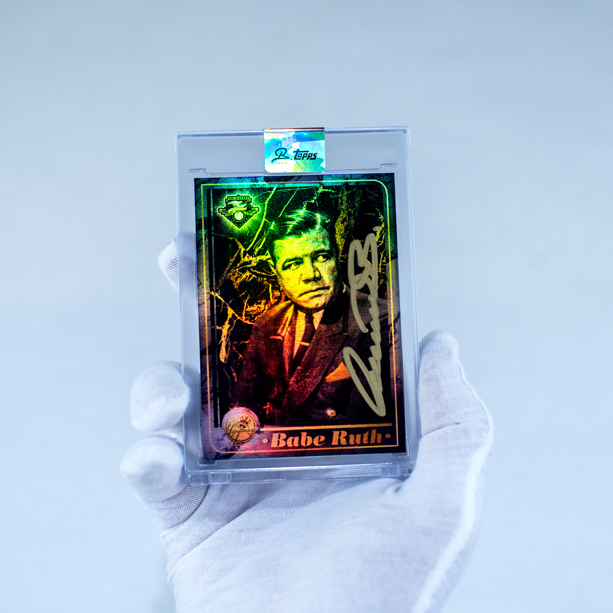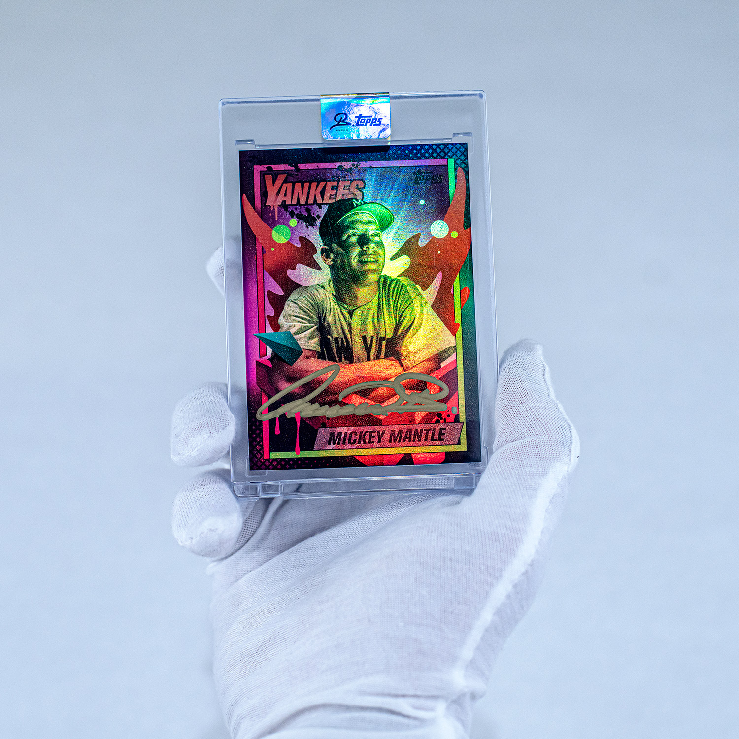 - Indkapslet i beskyttende plastiketui med Mikael B x Topps holografisk forsegling