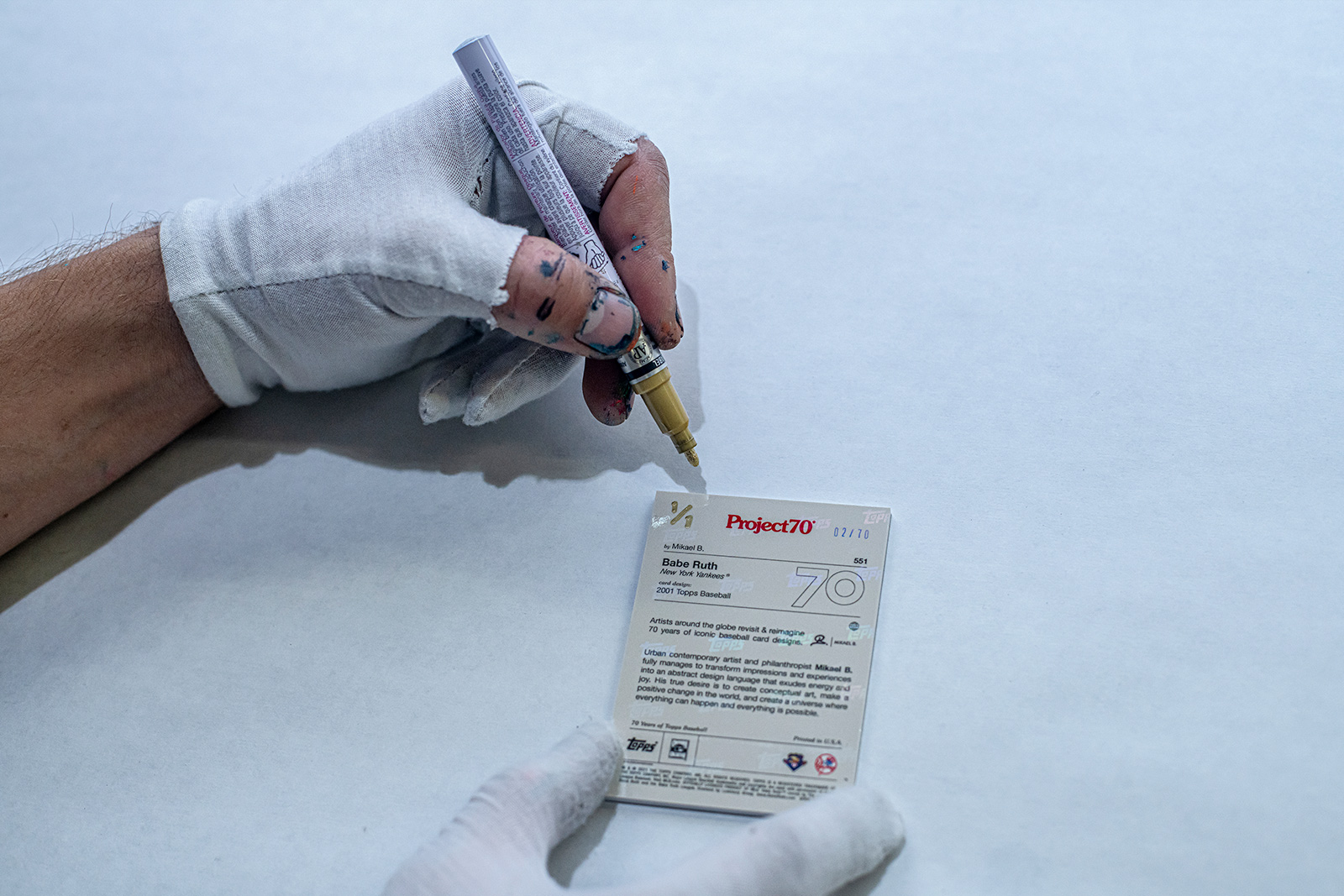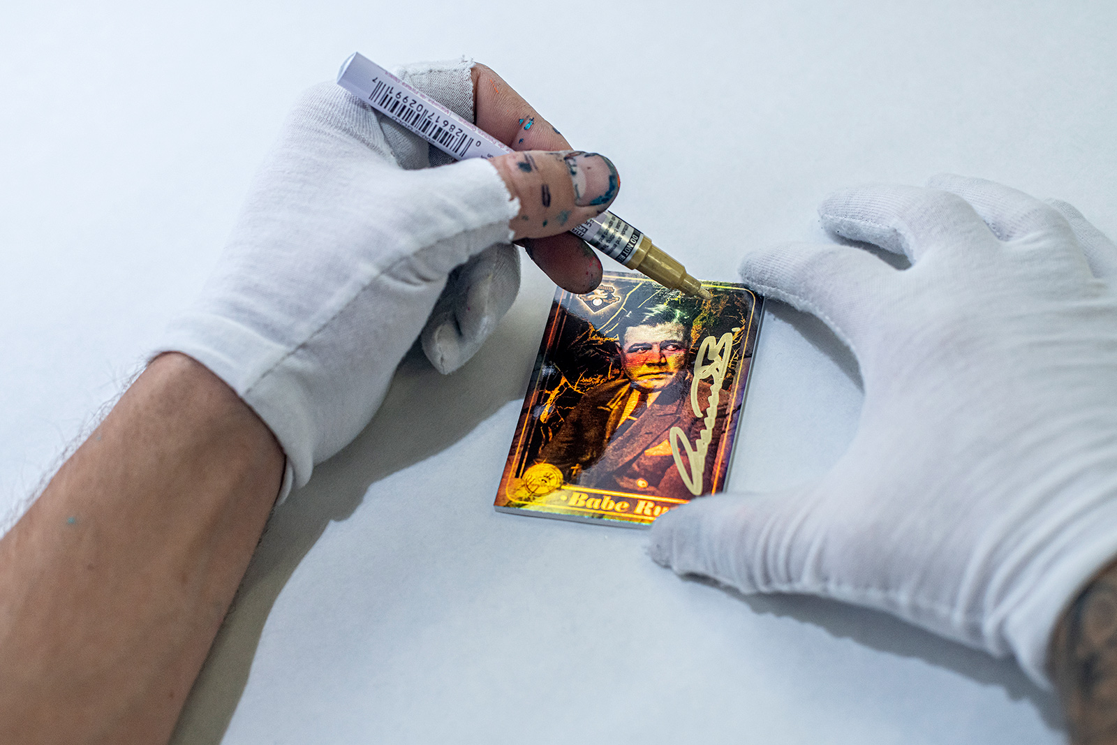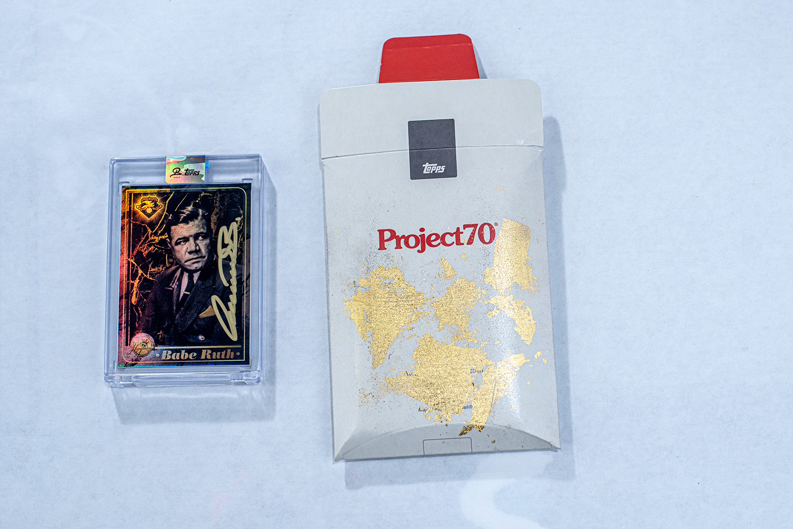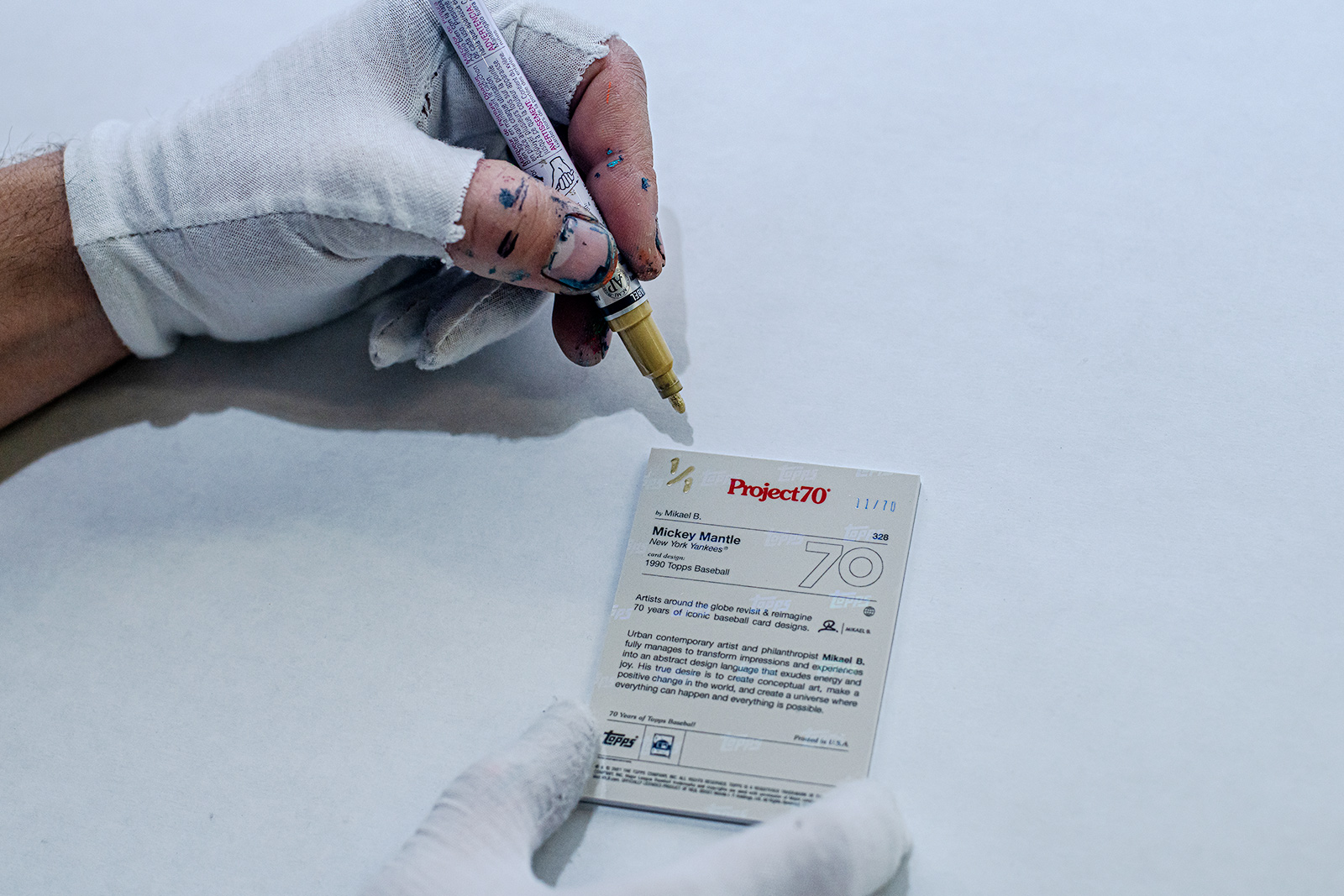 - Indkapslet i beskyttende plastiketui med Mikael B x Topps holografisk forsegling