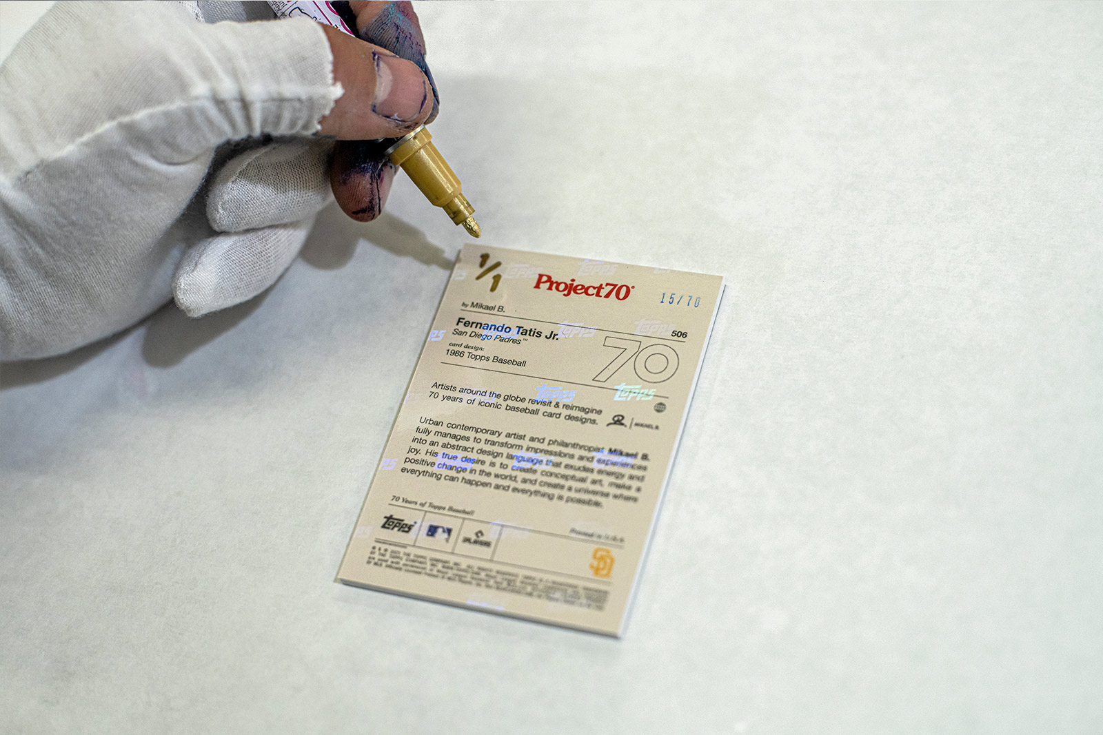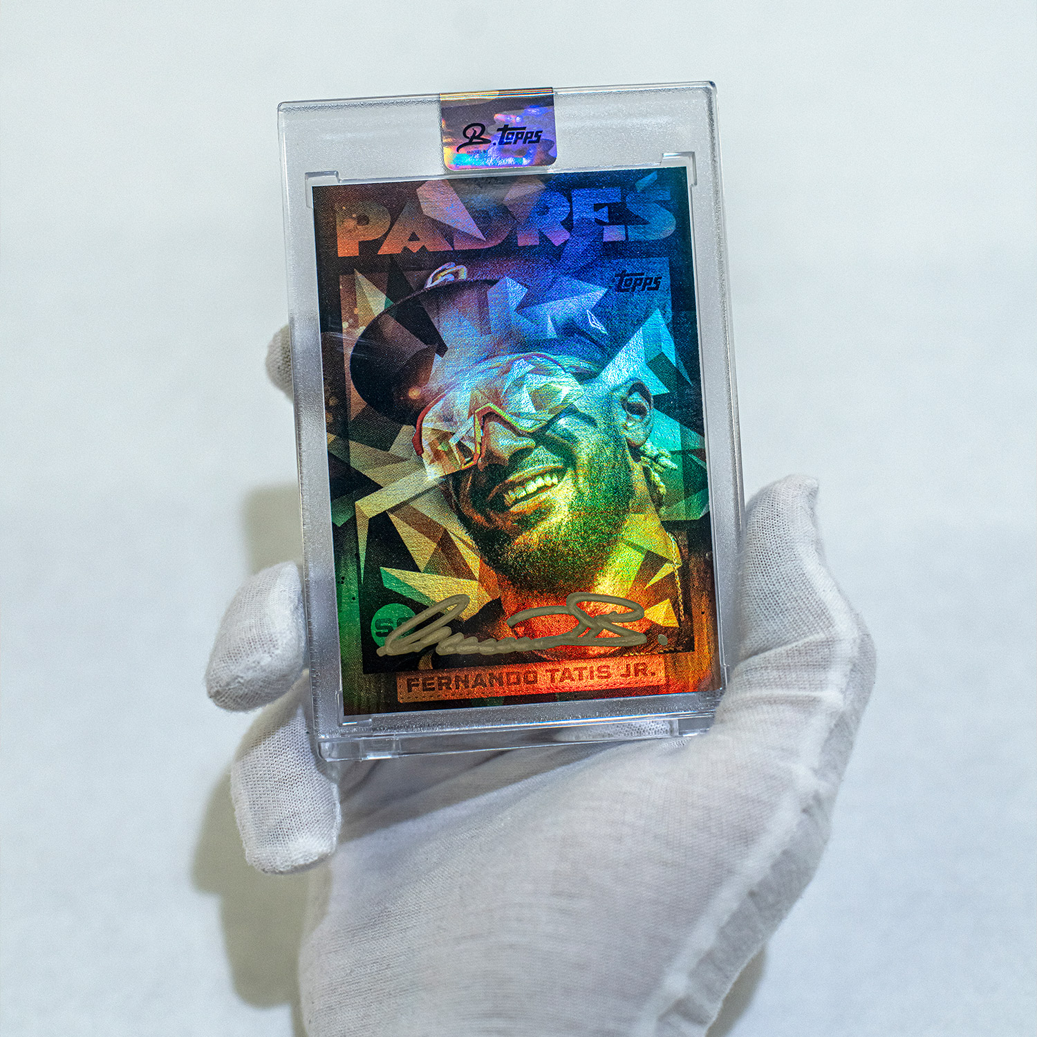 - Indkapslet i beskyttende plastiketui med Mikael B x Topps holografisk forsegling