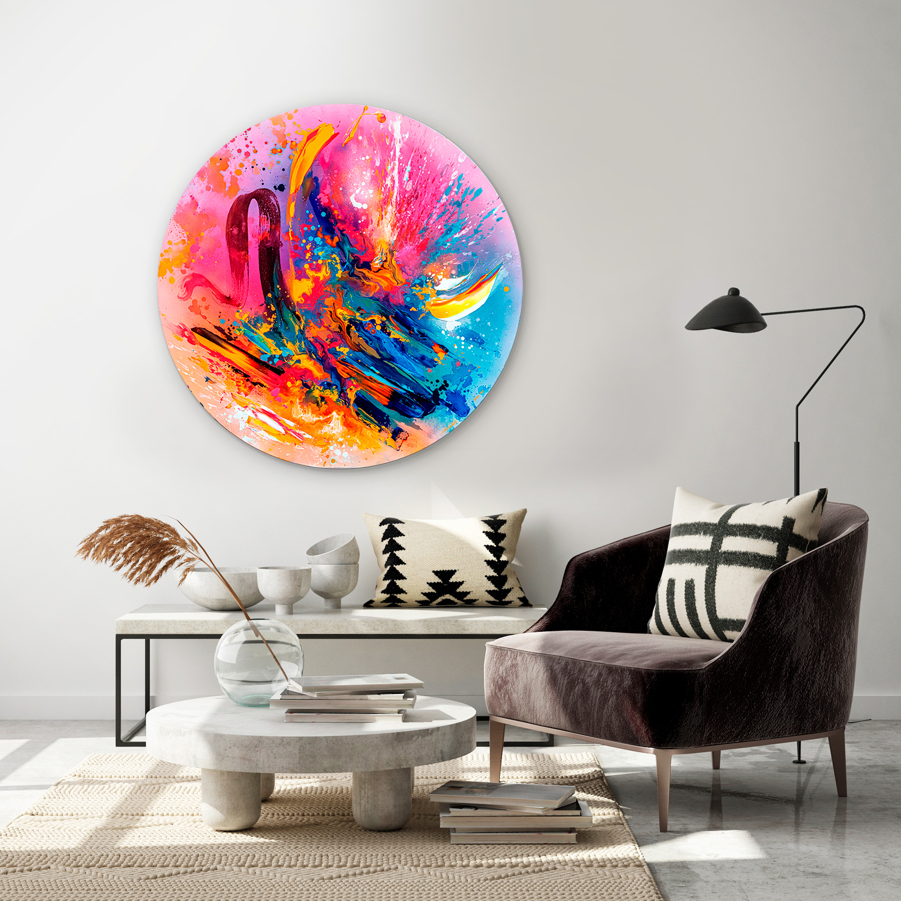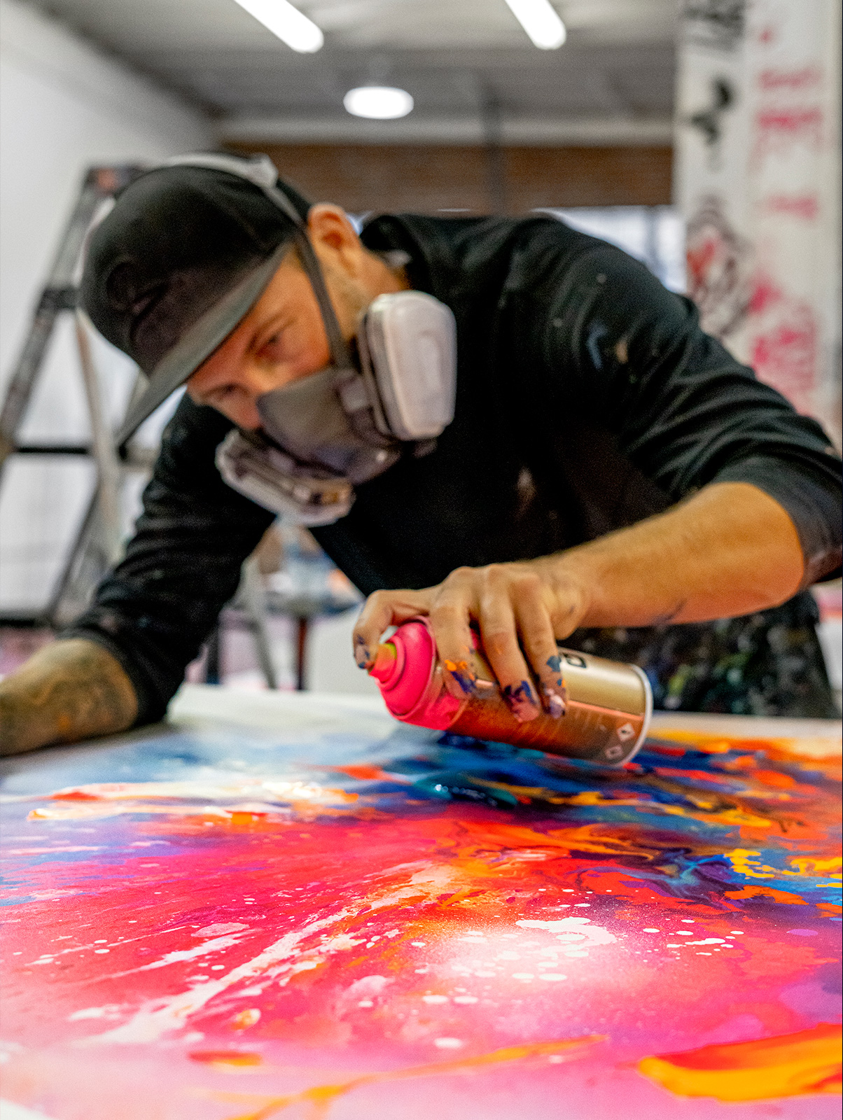 - Håndmalede detaljer med spray og multi-farvede penselstrøg med akryl