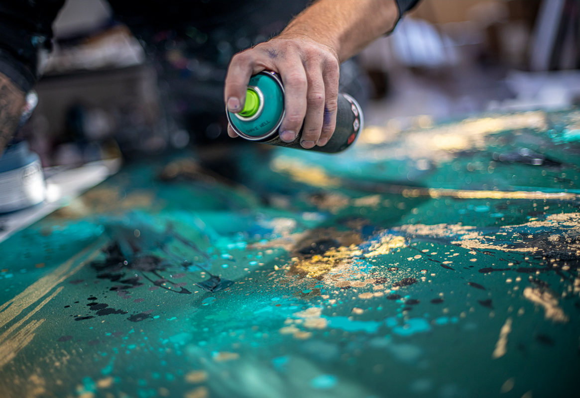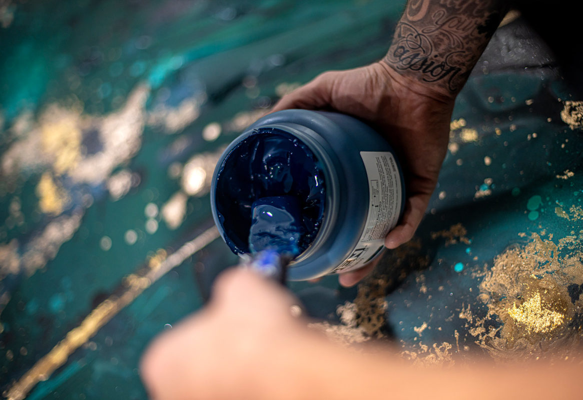 - Håndmalede detaljer: akryl, spray, bladguld, diamantstøv