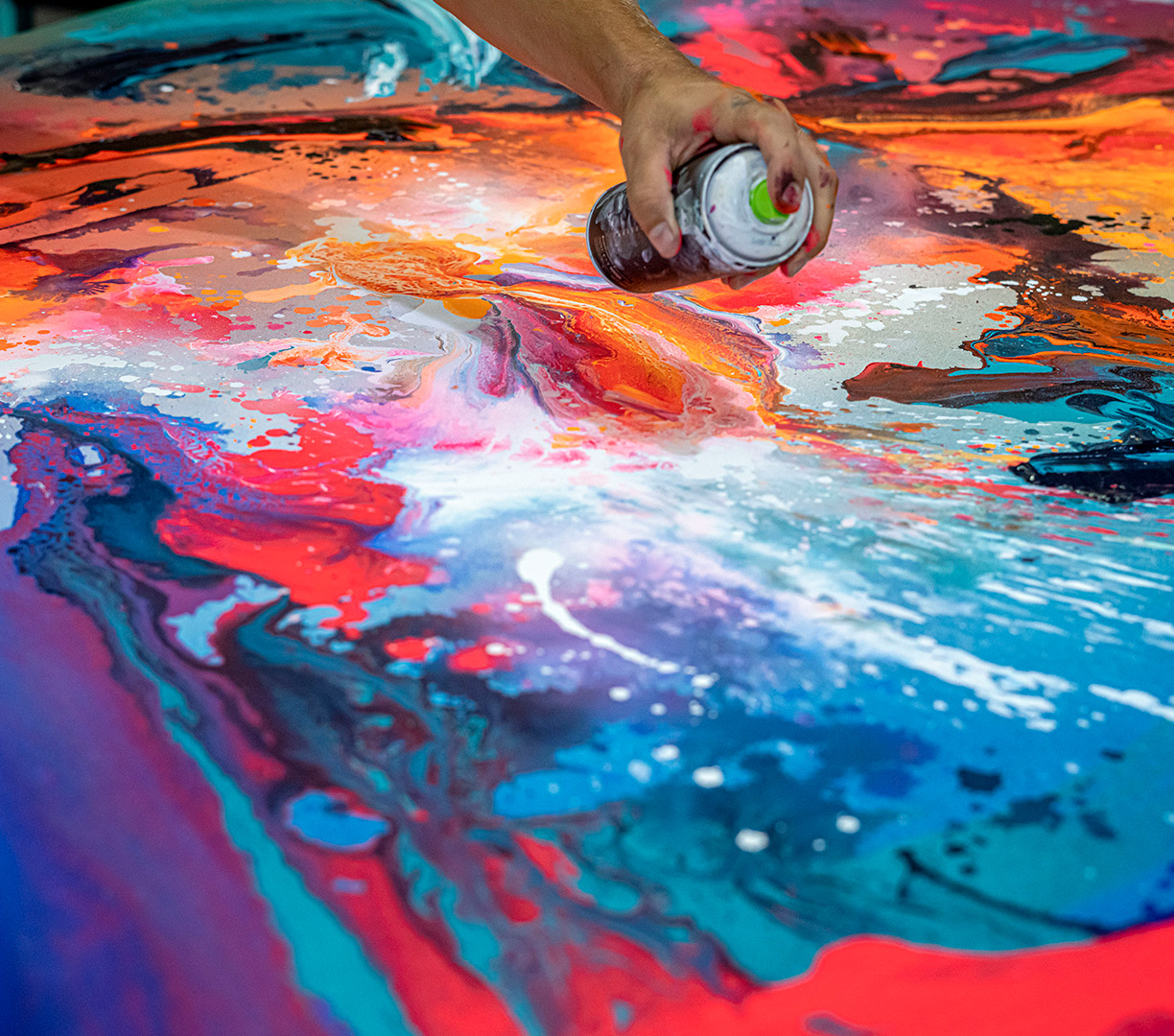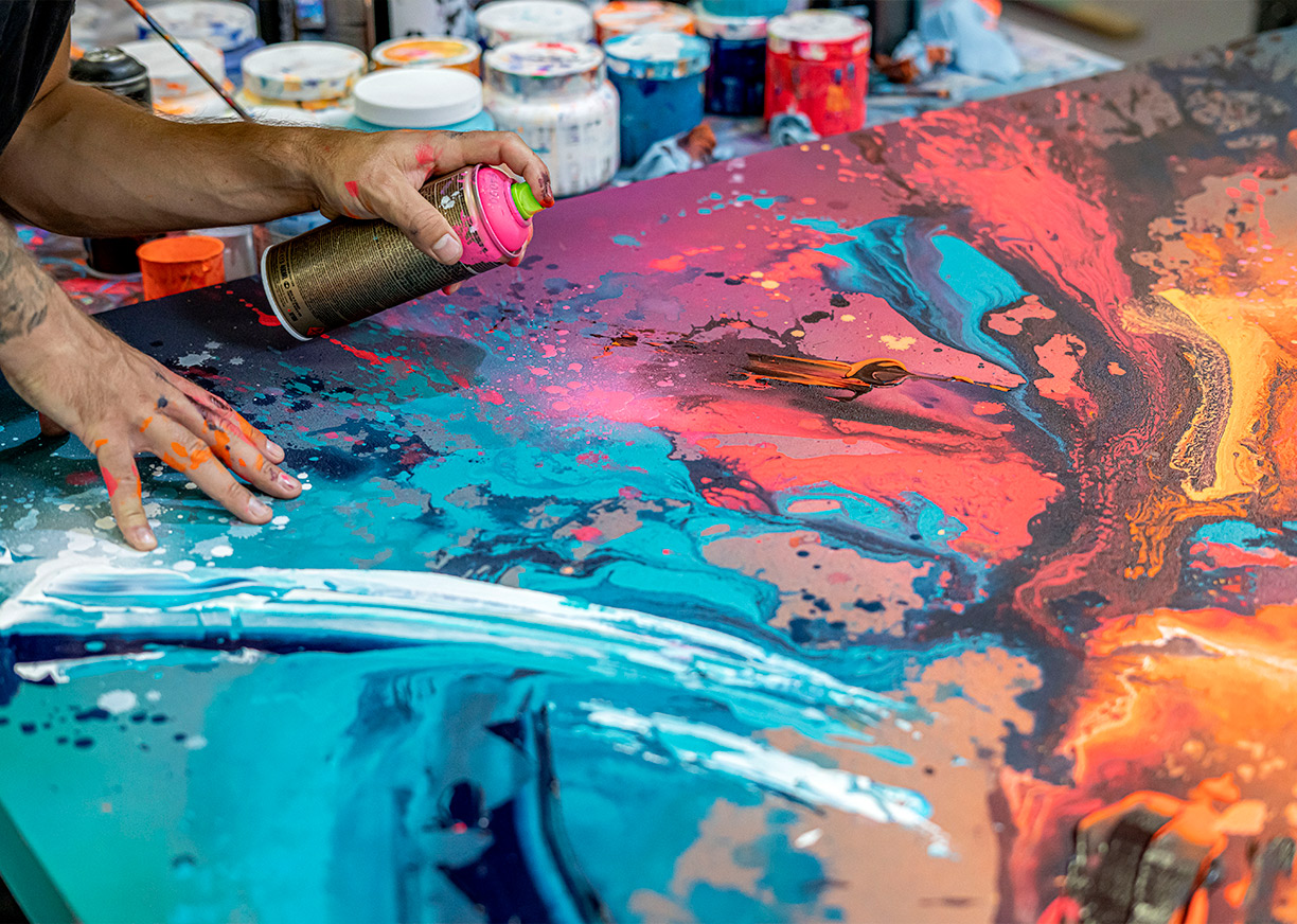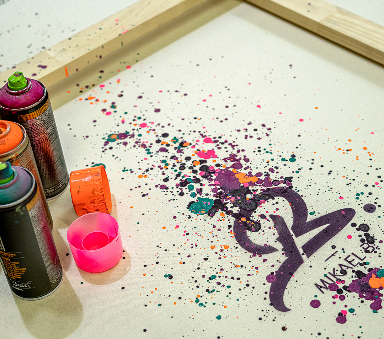 - Håndmalede detaljer med spray og multi-farvede penselstrøg med akryl