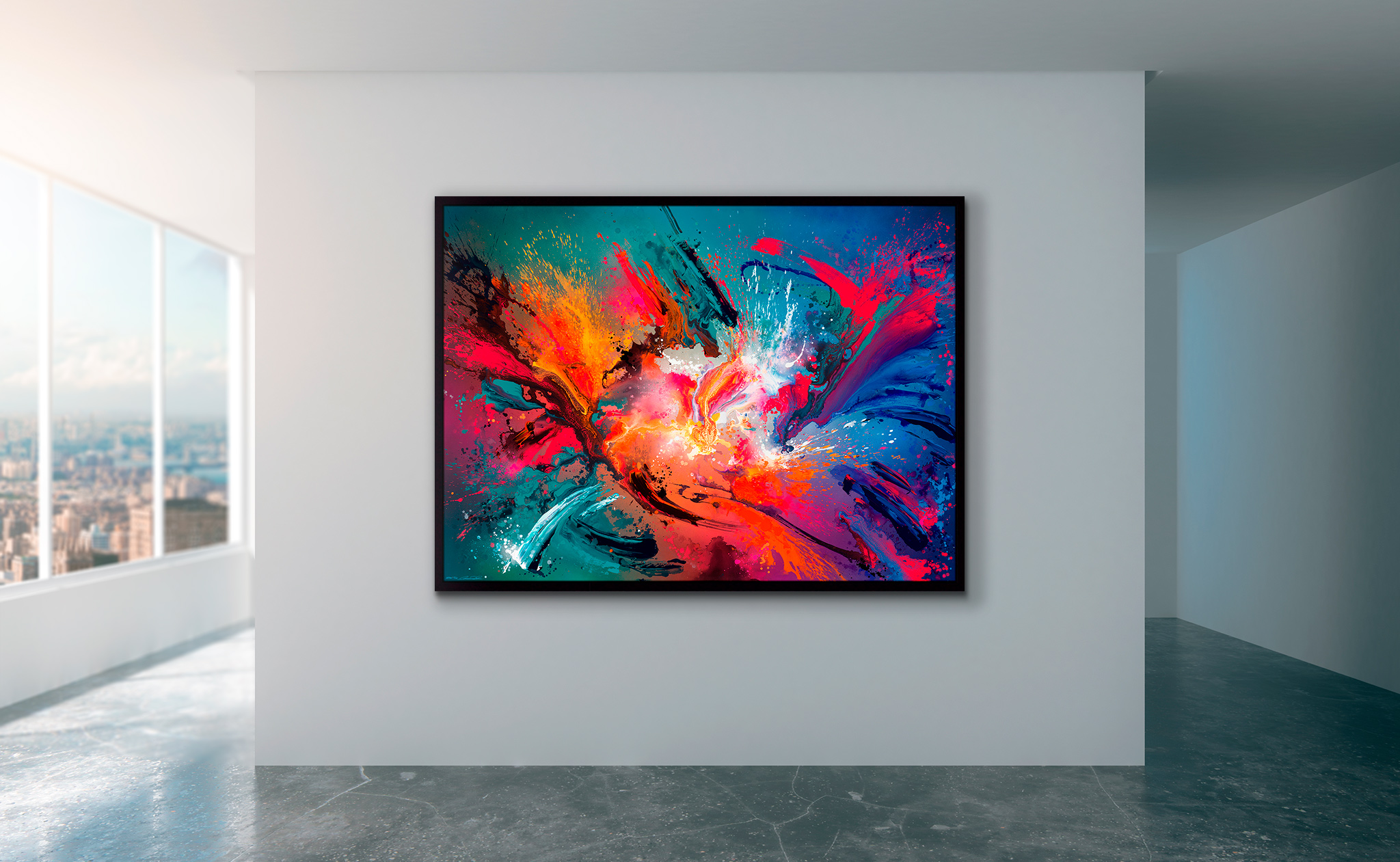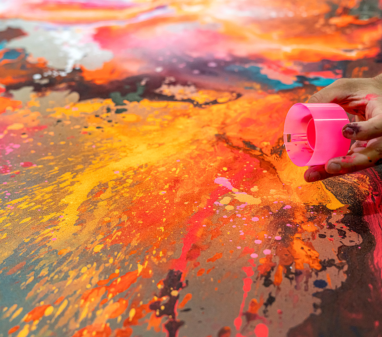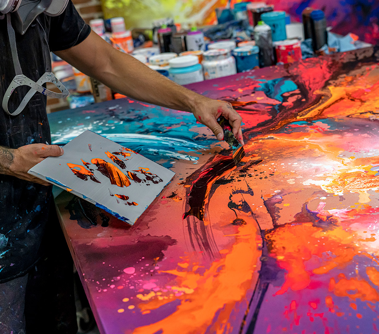 - Håndmalede detaljer med spray og multi-farvede penselstrøg med akryl