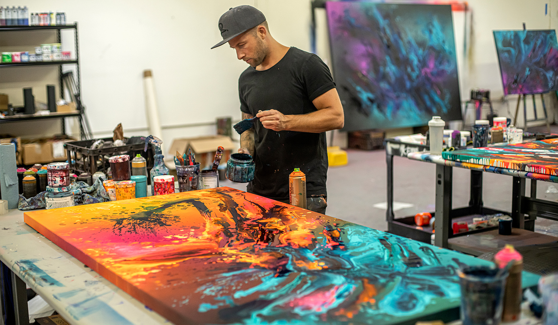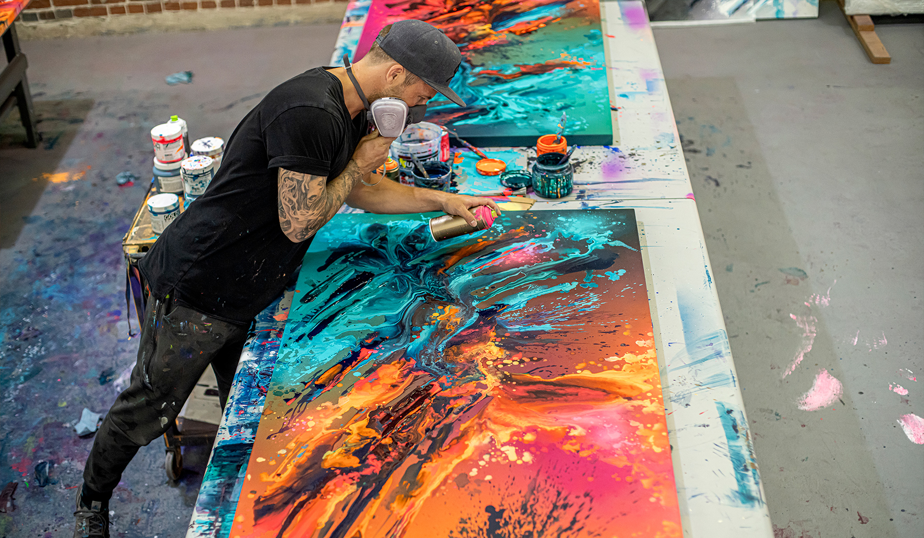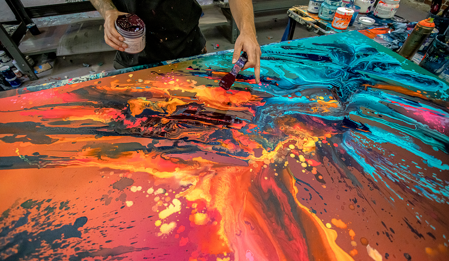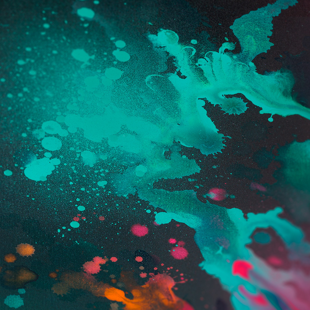 “Below The Surface”-malerierne har en tvetydig betydning for mig. Den ene er tanken om et vulkanudbrud under vandet. Formerne, farverne og teksturerne af lava, der dannes af undersøiske vulkaner. Vandet får den flydende magma til at afkøle og størkne meget hurtigere end i et udbrud på land, hvilket ofte resulterer i skabelsen af vulkansk glas.