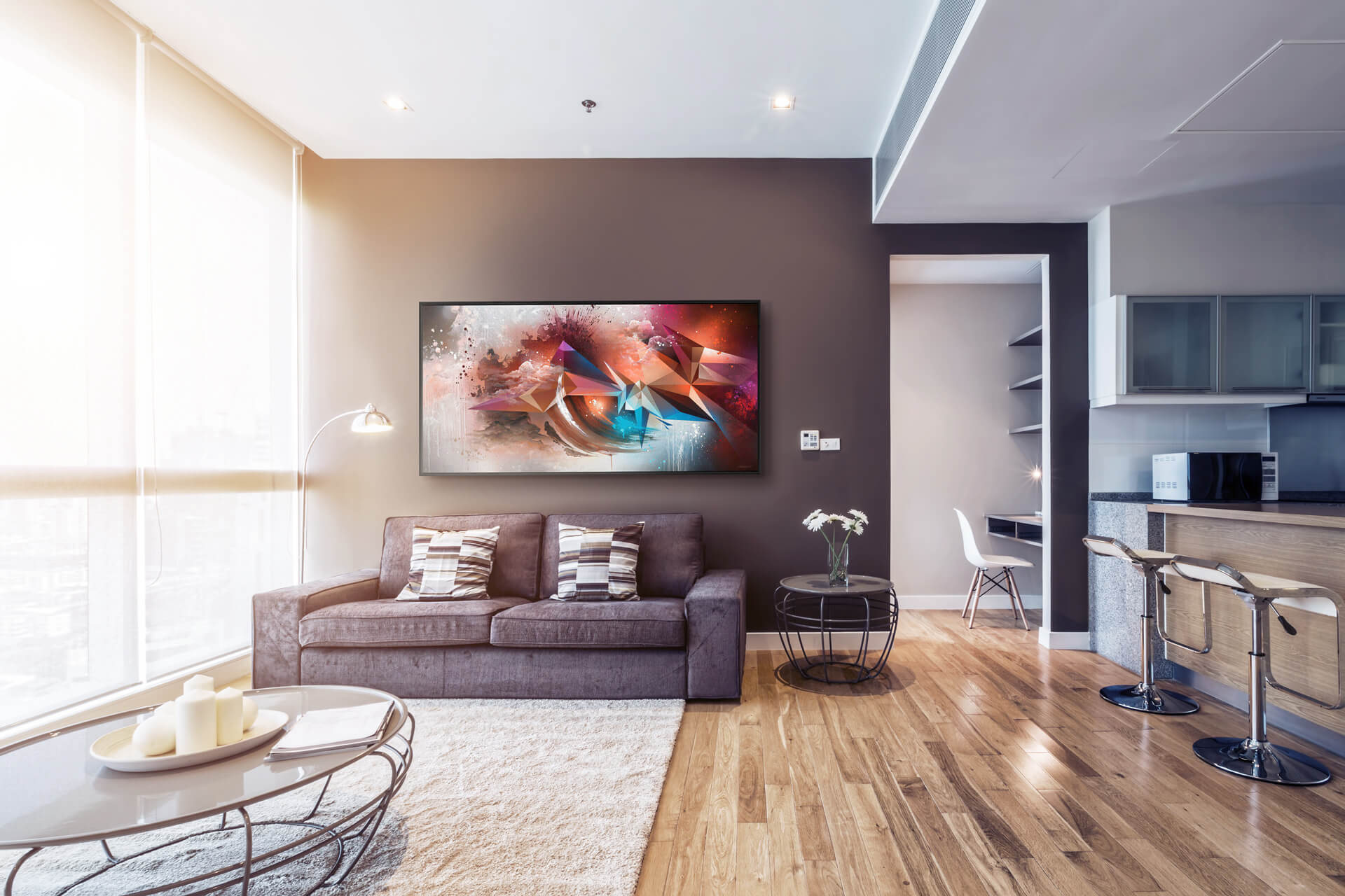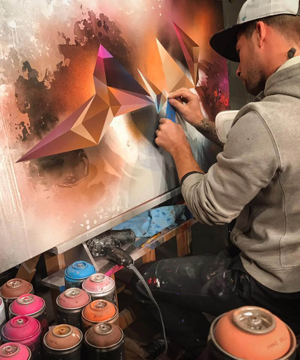 Mikael B’s foretrukne værktøjer til at skabe sine uendelige farveuniverser er akryl, pensel, tusch, og spraymaling. Med sin baggrund i grafisk design og graffiti kombinerer han geometriske former med vilde penselstrøg og dragende skylandskaber.