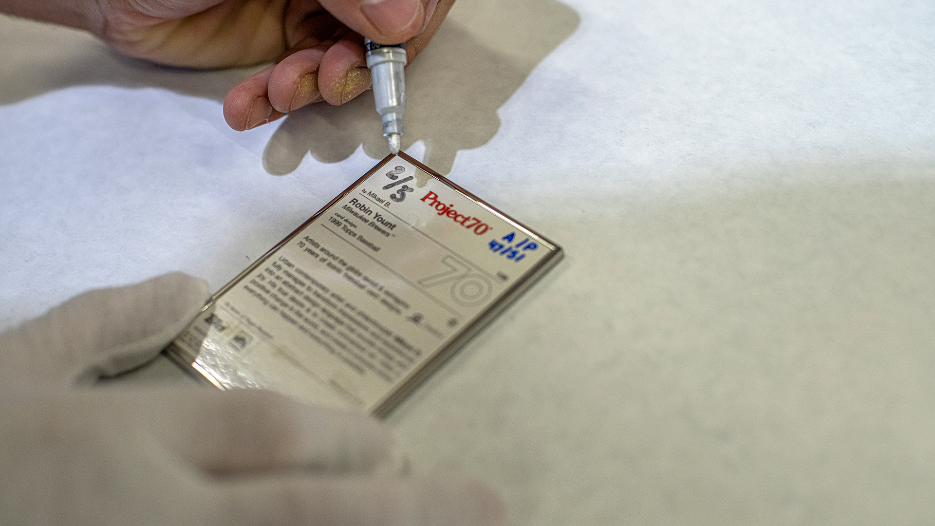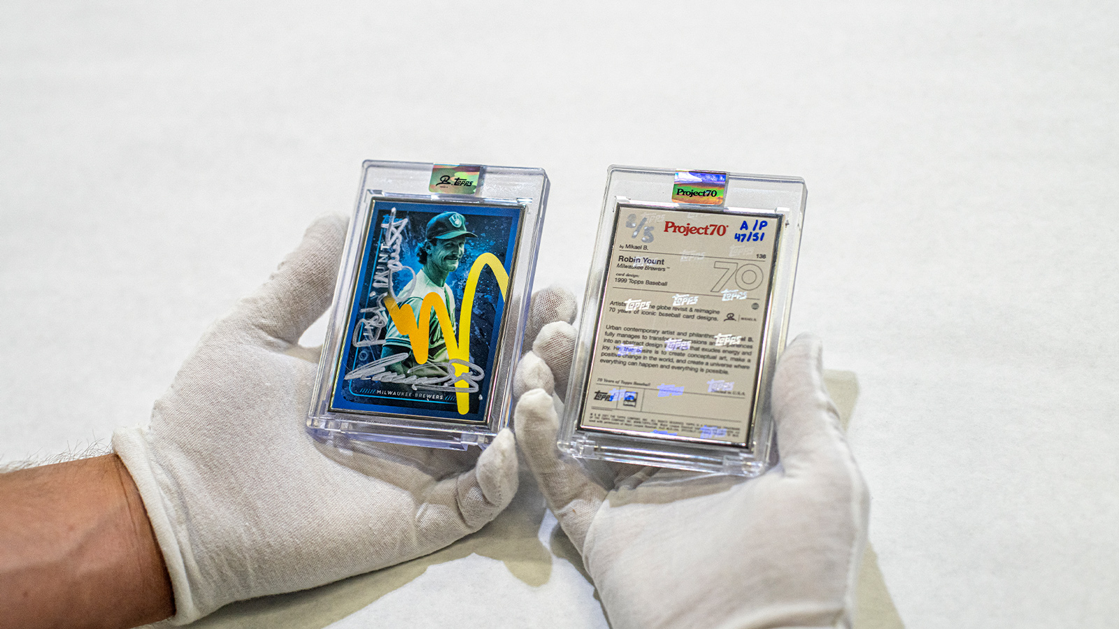 - Indkapslet i beskyttende plastiketui med Mikael B x Topps holografisk forsegling